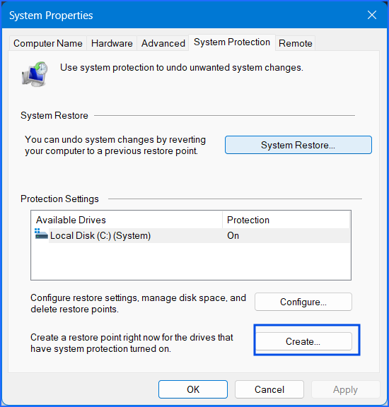 System Restore works only if System Protection is turned on for your Windows drive (usually Local Disk (C:)). If system protection is turned off, you won't be able to create a restore point to roll back to.